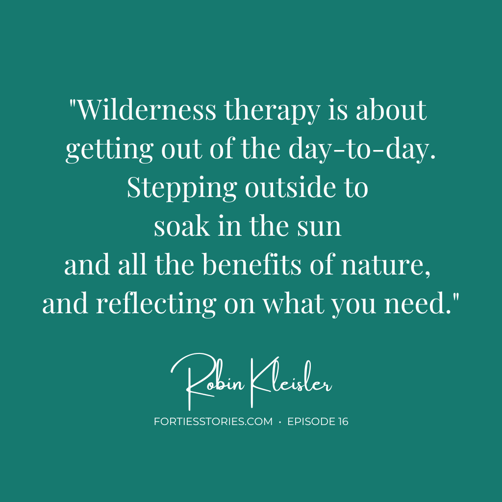 Getting outdoors without distraction, even for a few minutes a day, is rejuvenating and good for the soul. Its benefits are similar to meditation. This week, Robin Kleisler and I talk about the growing trend of wilderness therapy, the benefits of EMDR, and how you don’t have to worry about offending or shocking your therapist. Robin also discusses turning 40 and how she’s finally in a place where her kids are more self-sufficient, allowing her to rethink her priorities. Also, find out why I had a bit of trouble deciding on the title of this episode.